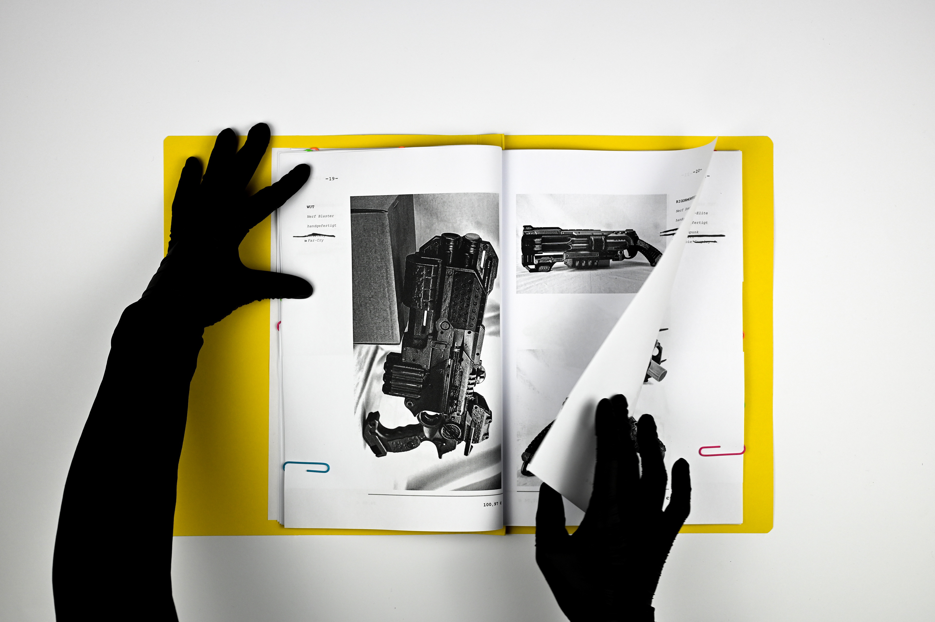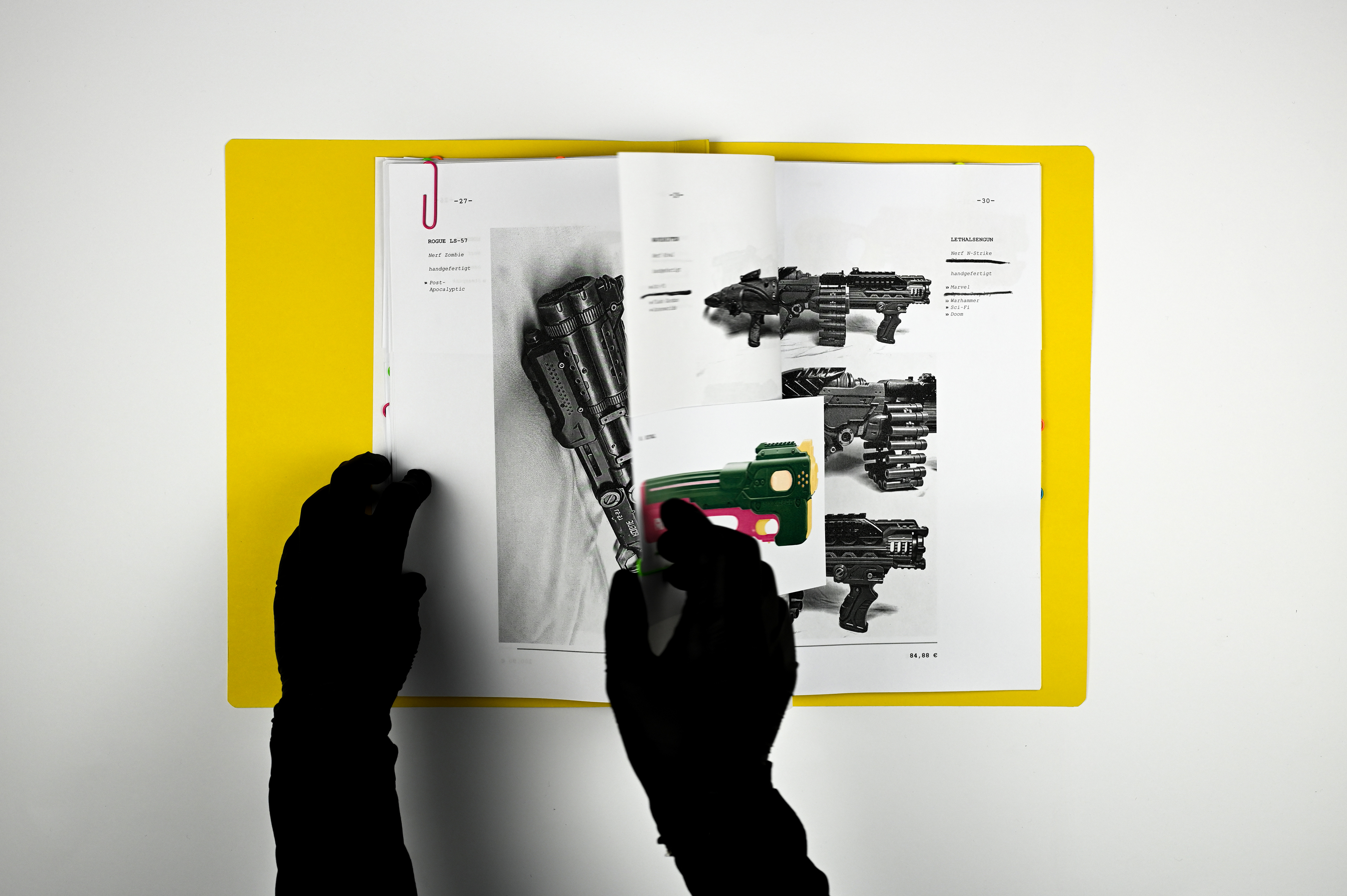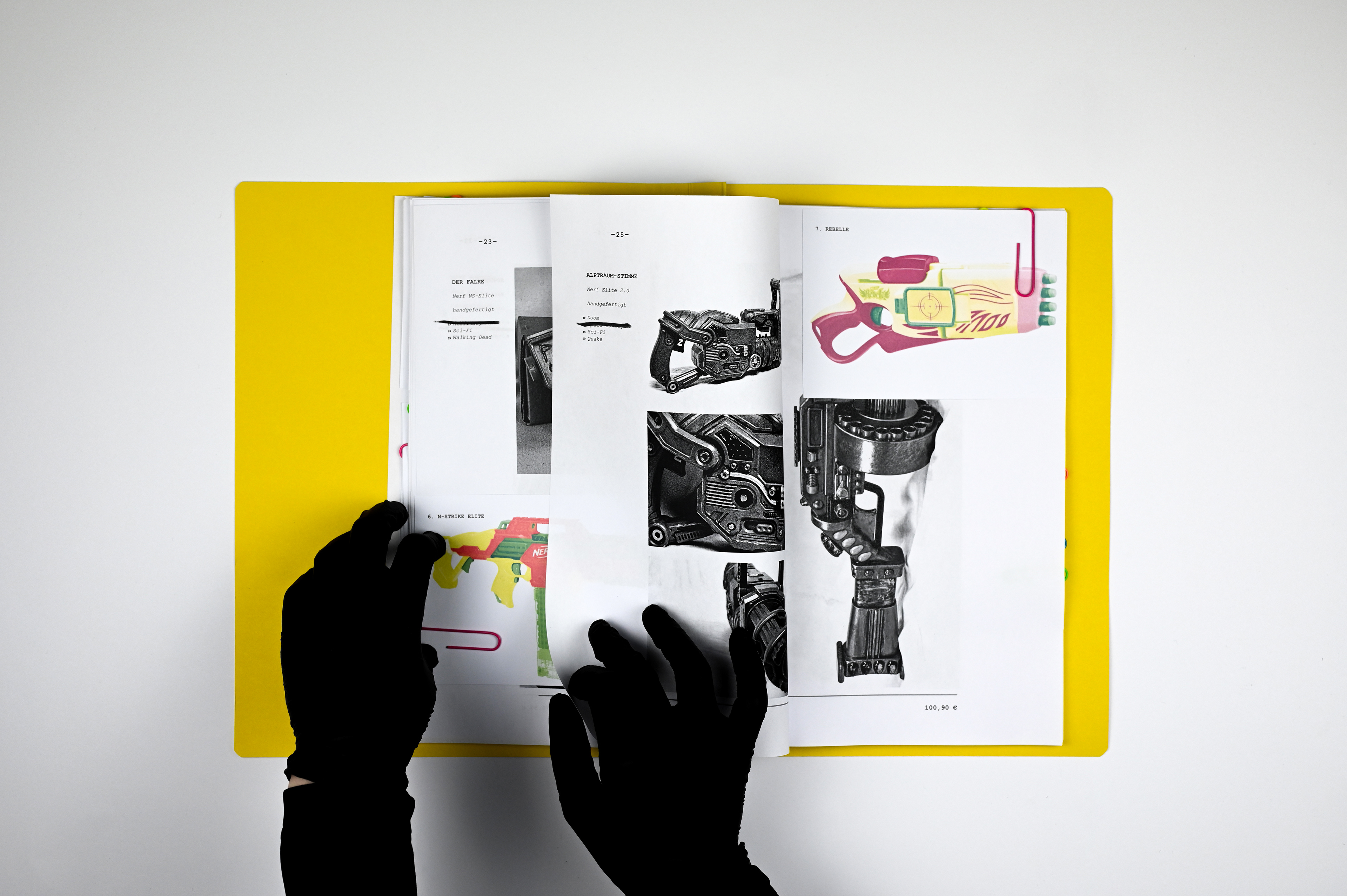 Wann ist eine Waffe eine Waffe? Die Publikation „Anscheinswaffe?“ beschäftigt sich mit der Frage, ab wann wir ein Spielzeug nicht mehr mit dem bloßen Auge als solches identifizieren können. Angelehnt an die Arbeit von Thomas Thwaites – „The Toaster Project“, der dafür bekannt ist, sich intensiv mit Objekten und ihrer Herkunft zu beschäftigen, ähnelt die Publikation einem Feldtagebuch, das alle Arten und Sorten der bis dato veröffentlichten und käuflich zu erwerbenden Nerfguns abbildet.